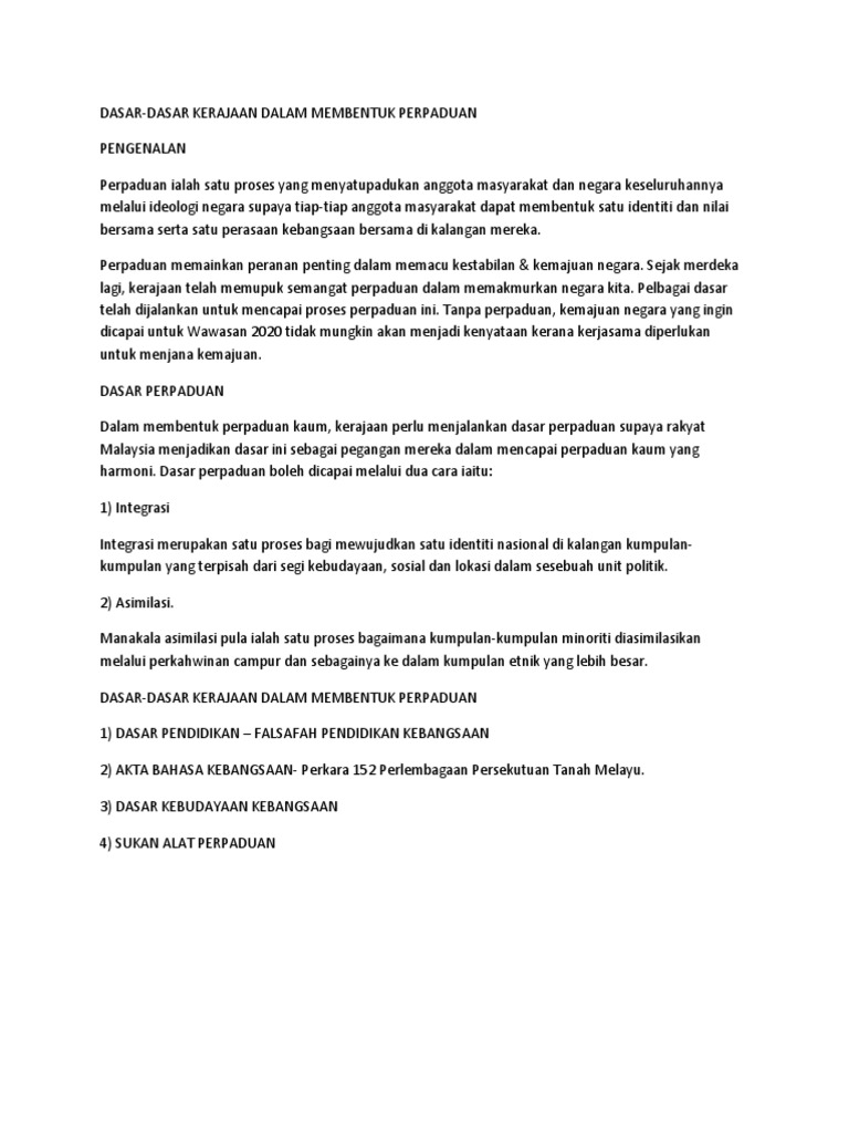 Sultan perak, sultan nazrin muizzudin shah bertitah, perlunya pengukuhan perpaduan dalam hasrat membangunkan negara yang aman lagi makmur. Konsep 1 malaysia ini memberi aspirasi untuk memperbaiki hubungan kaum bagi memastikan rakyat malaysia dapat menjalin perpaduan yang lebih erat. Keamanan negara turut dapat dipertingkatkan apabila amalan perpaduan kaum telah meresap ke dalam jiwa setiap rakyat malaysia. Malaysia merupakan salah sebuah negara yang berdaulat di rantau nusantara. Di antara kandungan pelajaran rukun negara yang harus diketengahkan.