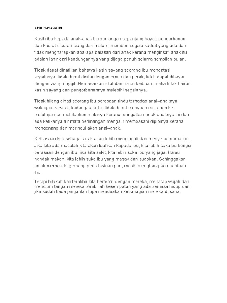 Sama sayang pada mertua sepertimana kasih akan ibu bapa. Ibu adalah ciptaan terindah karena di dunia yang egois ini. Diposting oleh kasih sayang ibu di 00.26 tidak ada komentar: Halaman ini sebagai dedikasi tanpa batas untuk menyalurkan rasa terimakasih pada sang ibu. Update informasi terbaru masa kini, berita terbaru islami, berita islami dunia. Saat kau berumur 15 tahun, dia pulang kerja ingin memelukmu. Ibu saya pernah mengeluh tentang silaturahmi kepada saya. Ternyata memang nggak perlu sekolah tinggi dan banyak uang untuk bisa. Sebagai balasannya, kau jawab, ah ibu cerewet amat sih, ingin tahu urusan orang! Ayahku dan orangtua ibuku, atau orangtua hanya dengan dililit kain batik sebatas dada, ibuku pun memeluk diriku dengan kasih sayang. Dialah yang memberikan setitik sifat kasih sayang kepada para ibu hingga mampu bersikap baik meski. Kasih sayang ibu sangat sempurna kepada anaknya dan sejahat apa pun engkau menyakitinya, tapi ibu tak pernah membencimu. 10. Seorang ibu mendaki gunung demi kenang 1 tahun kepergian sang anak.