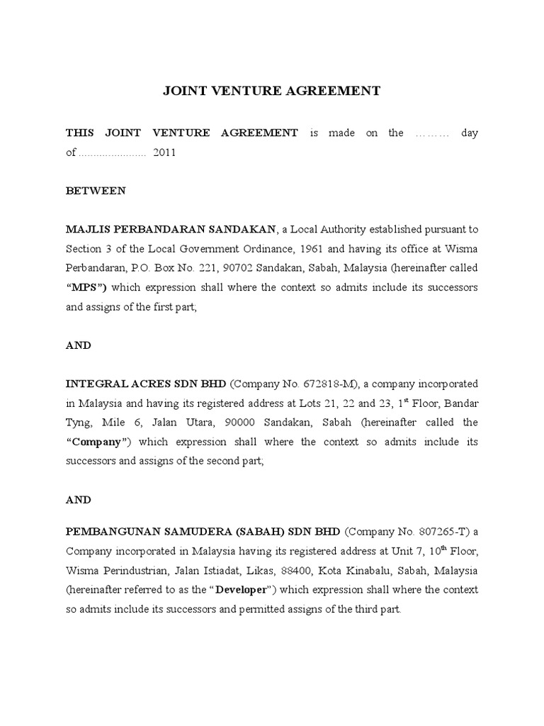 The principal objective of the joint venture was to increase the local assembly and manufacturing activities. All decisions of the management committee shall, desirably, be unanimous. Joint venture agreement malaysia sample. This joint venture agreement is established between: A joint venture is a strategic business arrangement or collaboration between two or more parties, where these parties agree to share their expertise, experience and resources to accomplish a common business activity, goal or project. Both parties would agree on the terms and rules of the joint venture agreement and once the project or activity is done, the joint venture ends as well. This joint venture agreement is established on 12 day of april, 2005. Joint venture agreement template malaysia 10/04/2021. 28 sep 2005 modification and clarifications in relation to circulars. These factors should include a balance between diligence and the business model. Joint ventures in malaysia can also be set up as. A joint venture in malaysia can only be registered under a company limited by shares or as a partnership. Introduction the board of directors (board) of prg holdings berhad (prg or the company) wishes.
