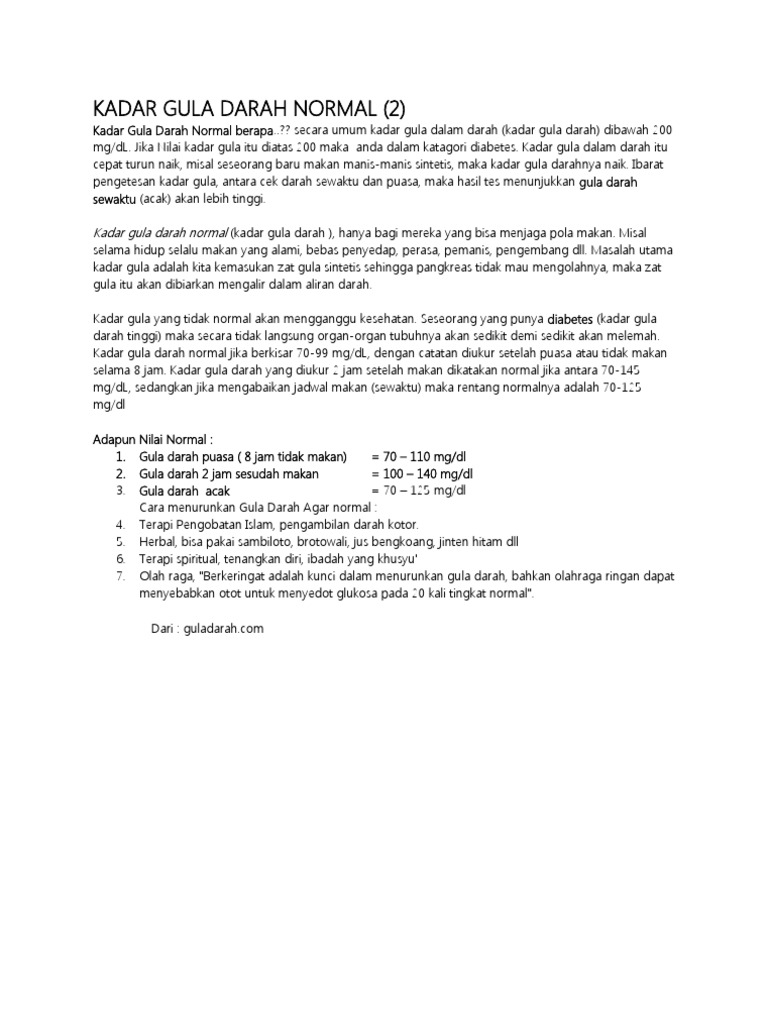 Kadar gula darah normal setelah puasa kurang lebih 8 jam adalah <100 mg/dl. Kadar gula darah puasa adalah gula darah yang diukur setelah melakukan puasa selama semalaman. Setelah makan, maka sistem pencernaan akan memecah karbohidrat menjadi gula atau disebut dengan glukosa supaya bisa diserap oleh tubuh. Penyakit yang akan ditimbulkan oleh penyakit gula darah ini adalah gangguan penglihatan mata, katarak, penyakit jantung, sakit ginjal, impotensi. Kadar gula darah normal penting untuk dijaga agar tidak terlalu tinggi atau terlalu rendah. Berikut ini kisaran kadar gula darah normal pada tubuh manusia Sebelumnya, pahami dulu bagaimana tubuh gula darah dihasilkan dan dibutuhkan. Berikut cara menjaga kadar gula darah tetap normal. Fluktuasi gula darah pasti terjadi seiring dengan konsumsi makanan sepanjang hari dan kemampuan oleh sebab itu, mengetahui kadar normal glukosa darah sangatlah penting. Ibarat pengetesan kadar gula, antara cek darah sewaktu dan puasa, maka hasil tes menunjukkan (acak) akan lebih tinggi. Kadar gula darah normal tidak hanya memiliki satu jenis nilai normal yang baku untuk setiap orang dengan jenis kondisi yang berbeda. Kadar gula darah normal (kadar gula darah. Kadar gula darah yang terlalu rendah atau diistilahkan hipoglikemia dan gula terlalu tinggi (hiperglikemia) bisa berdampak negatif pada kesehatan.