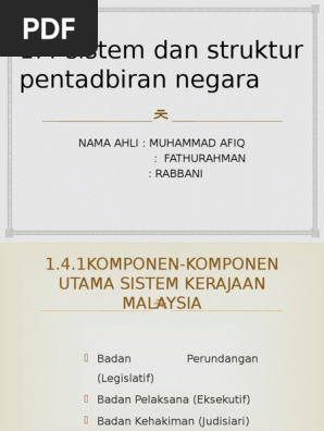 Malaysia merupakan negara berdaulat menggunakan sistem politik demokrasi berparlimen. Kerajaan tempatan adalah di bawah bidang kuasa pbt seperti yang telah ditetapkan di bawah butiran 4 senarai kedua jadual kesembilan perlembagaan persekutuan. Ia menjelaskan bidang kuasa kerajaan persekutuan, kerajaan negeri dan kerajaan tempatan. Pegawai keselamatan ict mampu (ictso) ketua pegawai maklumat kerajaan (gcio) piagam pelanggan. Buktikan sejauhmanakah struktur pentadbiran kerajaan dapat mengukuhkan pembinaan negara bangsa 1.0 pengenalan sistem pengasingan kuasa diterima pakai sebagai struktur pentadbiran selepas malaysia mencapai kemerdekaan.