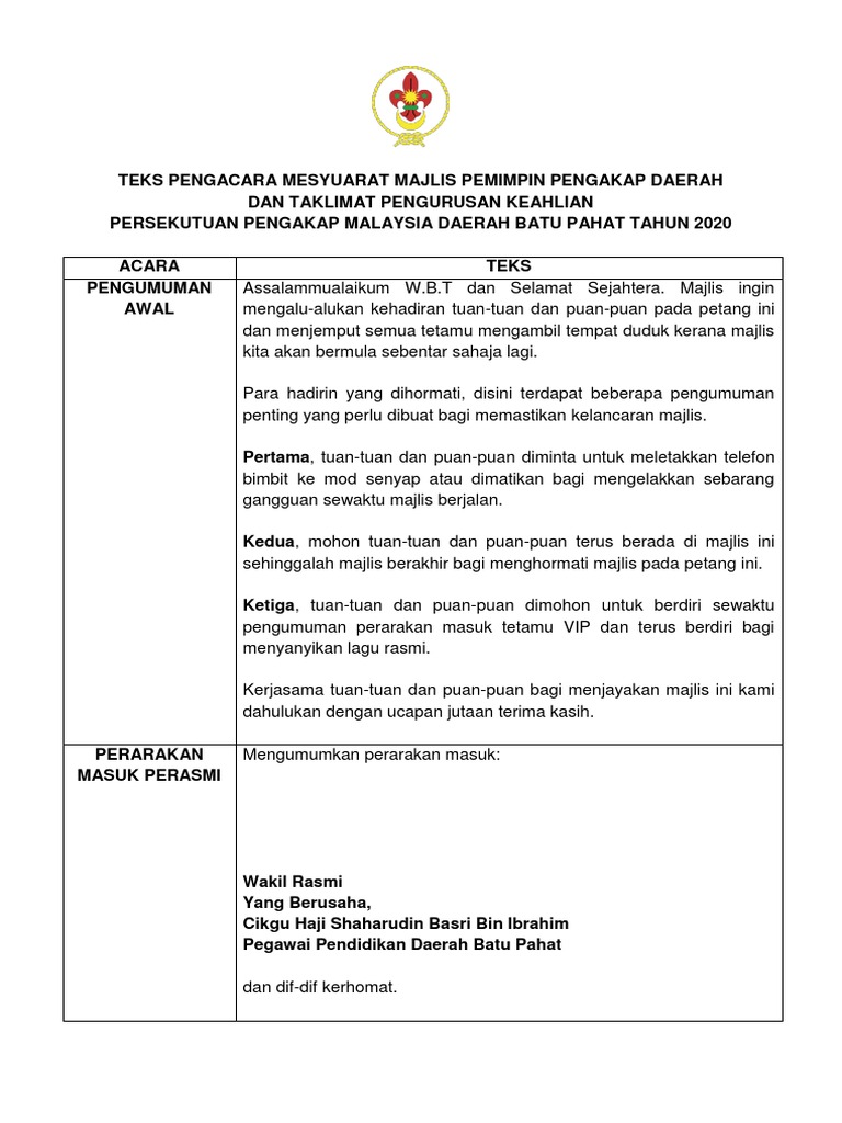Teks pengacara majlis persaraan pn jaharah. Bissmillahirrahmanirahim assalamualaikum,salam sejahtera.dan salam 1 malaysia. Teks pengacara majlis penutupan perkhemahan perdana. Bagi memastikan majlis berjalan dengan lancar, hadirin diingatkan agar mematikan atau memastikan telefon bimbit berada dalam pengaturcaraan senyap. Majlis penandaarasan 5s dari smk seri jempol. Koleksi teks/skrip pengacara majlis untuk pelbagai majlis rasmi di sekolah 2 3. Koleksi teks/skrip pengacara majlis untuk pelbagai majlis rasmi di sekolah (cikgu raihan blog) 2. Semakan bantuan zakat maik kelantan Kertas kerja bahas ala parlimen 2016. Gambus, cara pembuatan dan cara memainkannya; Tempat latihan industri di kedah; Teks pidato bahasa melayu peringkat antarabangsa; Skrip juruacara majlis bicara buku dan perkongsian ilmu via www.slideshare.net.